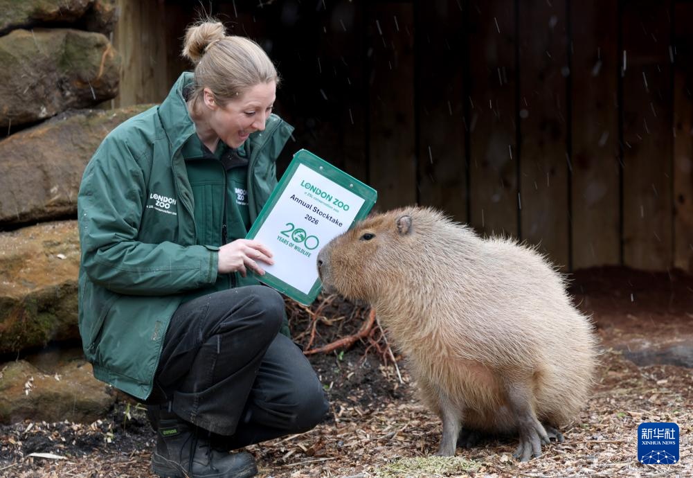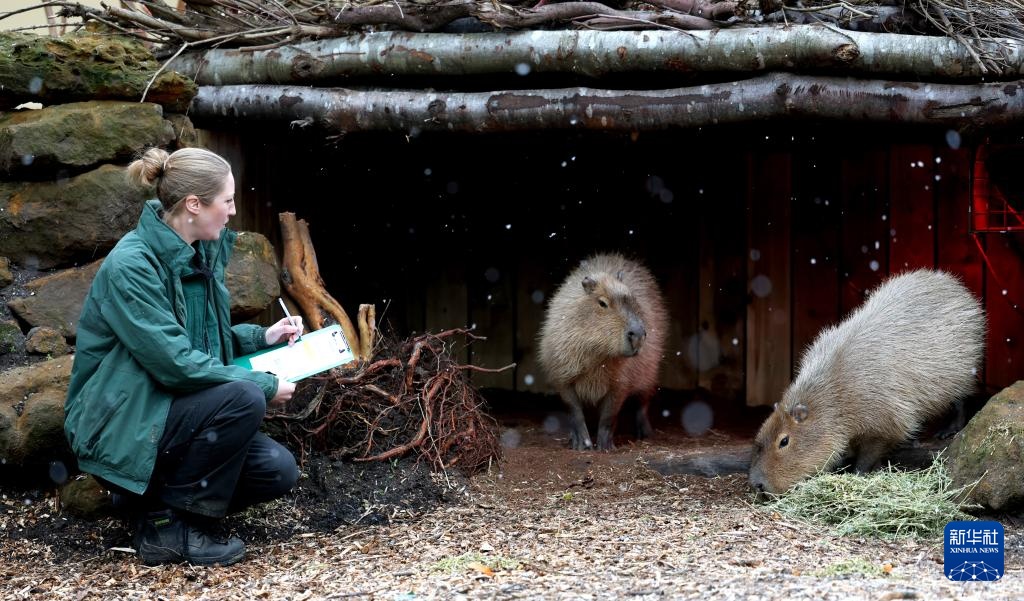1月6日,在英国伦敦动物园,一名工作人员在雪中对水豚进行盘点。新华社记者 李颖 摄