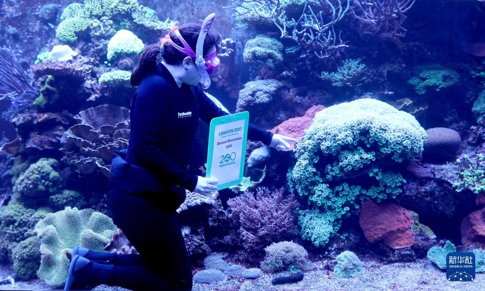 1月6日,在英国伦敦动物园,一名工作人员对珊瑚进行盘点。新华社记者 李颖 摄
