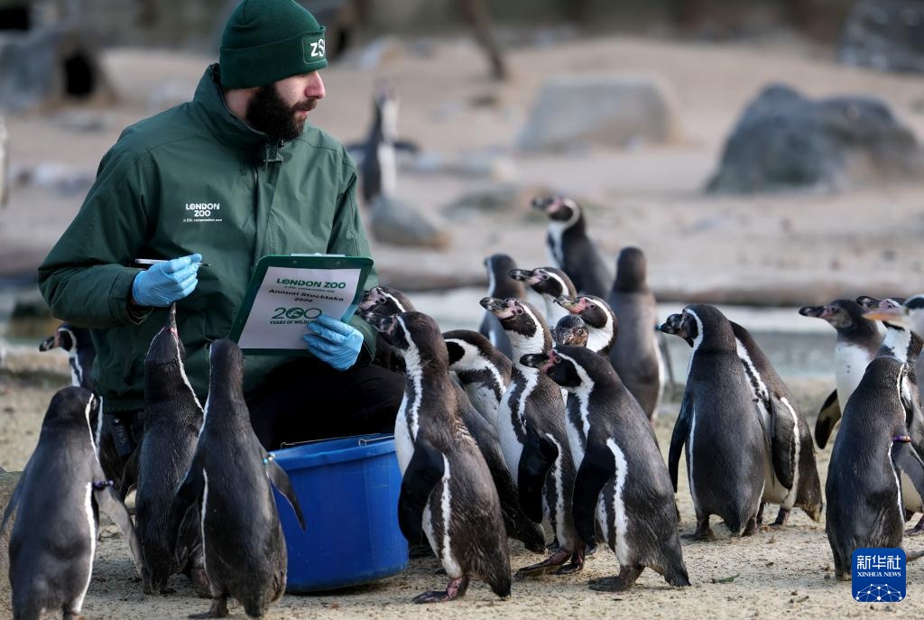 1月6日,在英国伦敦动物园,一名工作人员对企鹅进行盘点。新华社记者 李颖 摄