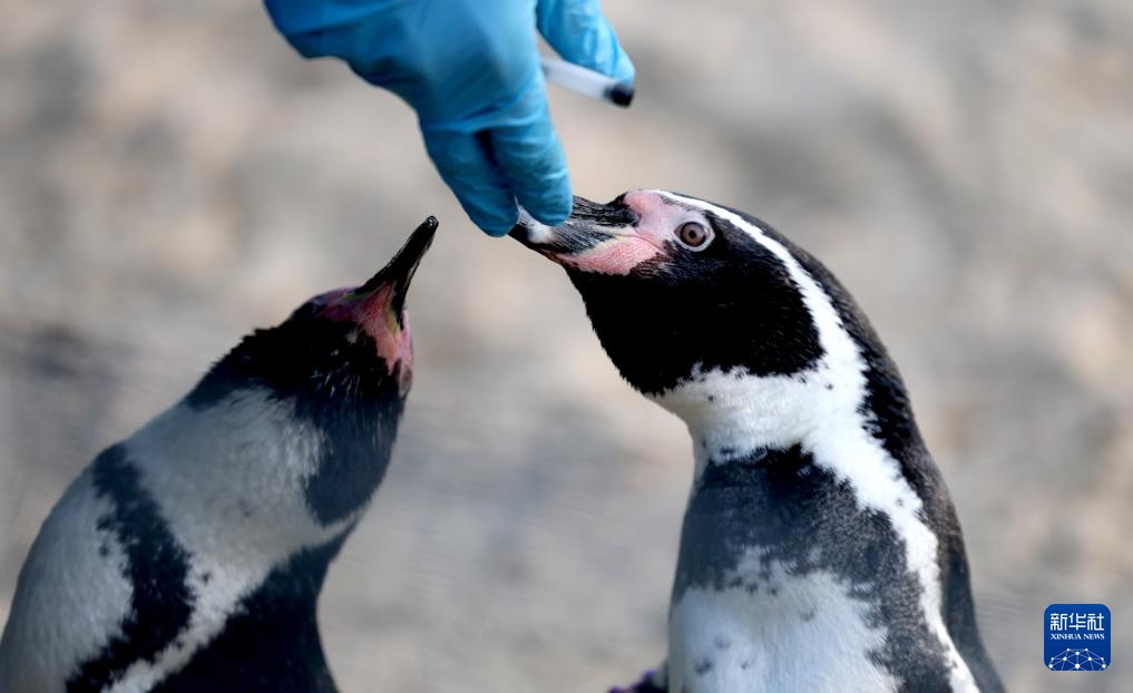 1月6日,在英国伦敦动物园,一名工作人员在盘点时喂食企鹅。新华社记者 李颖 摄