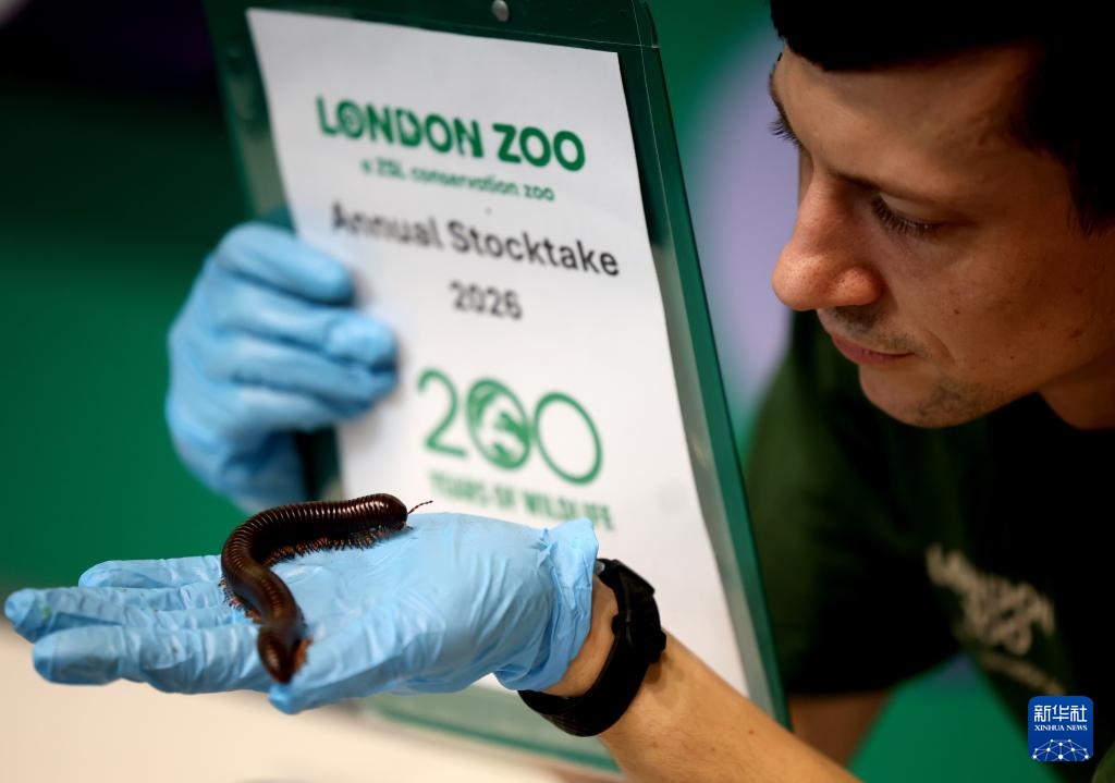 1月6日,在英国伦敦动物园,一名工作人员对千足虫进行盘点。新华社记者 李颖 摄